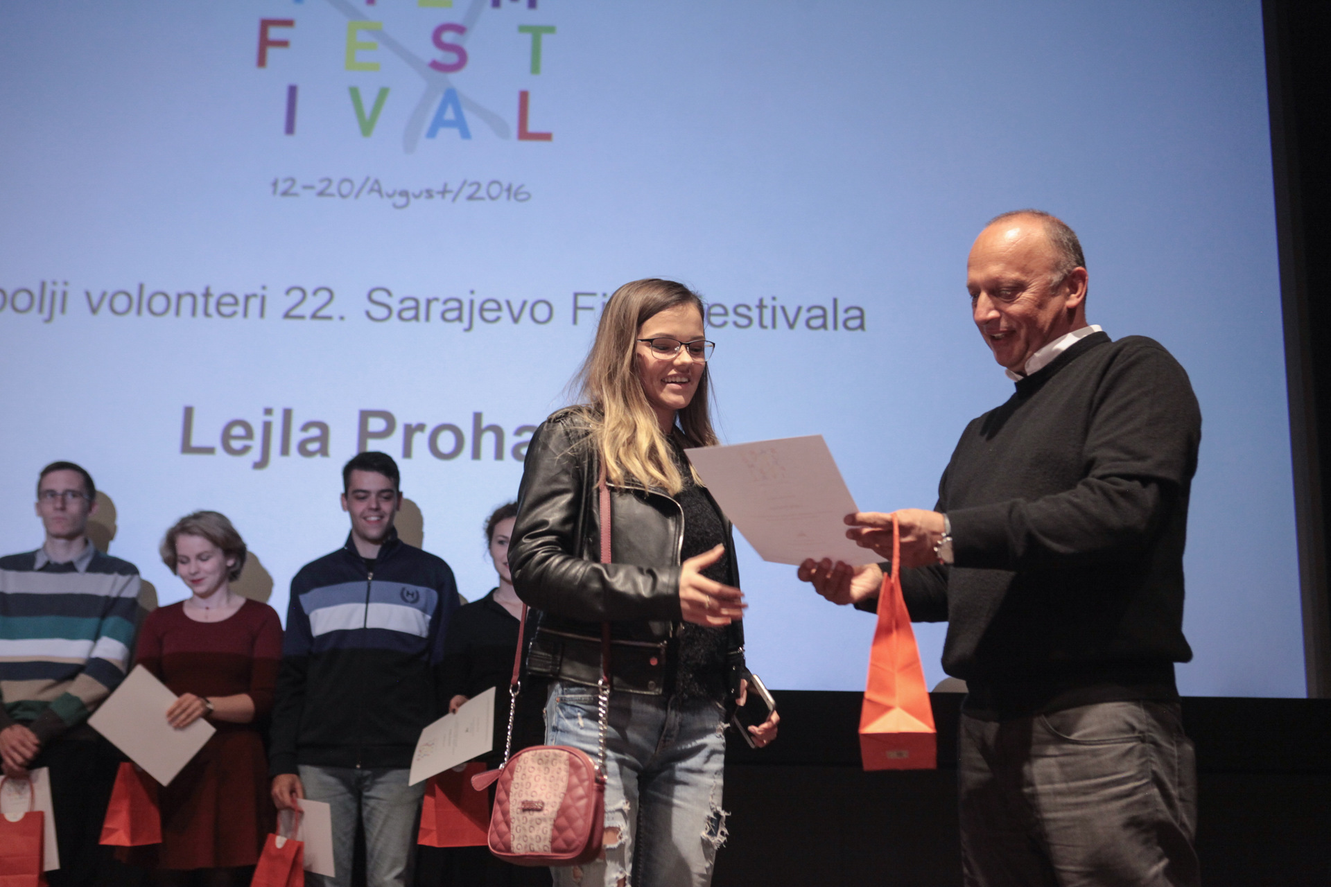 A total of 396 volunteers contributed to the success of the 22nd Sarajevo Film Festival, among them 40 men and women who exhibited exceptional commitment, namely: Bojan Kavaja, Mateo Bunjevac, Selma Bašić, Adi Tursić, Ajla Zečević, Dino Tozo, Mateo Danilović, Naila Krupić, Merjema Đipa, Nino Pezer, Emina Šabić, Hana Jusić, Kenan Čampara, Lejla Moeller, Adna Hrapović, Faris Bečić, Jasmina Sikira, Lejla Prohan, Mirnesa Cviko, Rijad Skopljak, Sara Čorbić Mustafić, Almir Mulalić, Ena Mičević, Farah Dolić, Faruk Divović, Nejla Burdžović, Senad Bešić, Amna Pezo, Amra Šeta, Ema Kobal, Amina Grbo, Lejla Mahmić, Sedina Muhibić, Omar Jašarspahić, Armin Papović, Belkisa Podžić, Sandro Lukežić, David Jotevski, Denis Trivanović and Ana Hrboka.