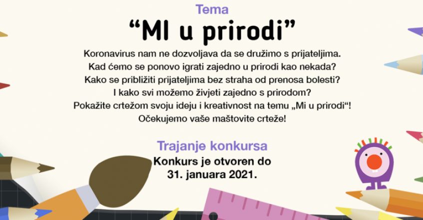 Ove godine svi crtaju na temu “Mi u prirodi”. Koronavirus nam ne dozvoljava da se družimo s prijateljima. Kad ćemo se ponovo igrati zajedno u prirodi kao nekada? Kako se približiti prijateljima bez straha od prenosa bolesti? I kako svi možemo živjeti zajedno s prirodom? Nacrtaj svoju ideju! Čekamo tvoje crteže!